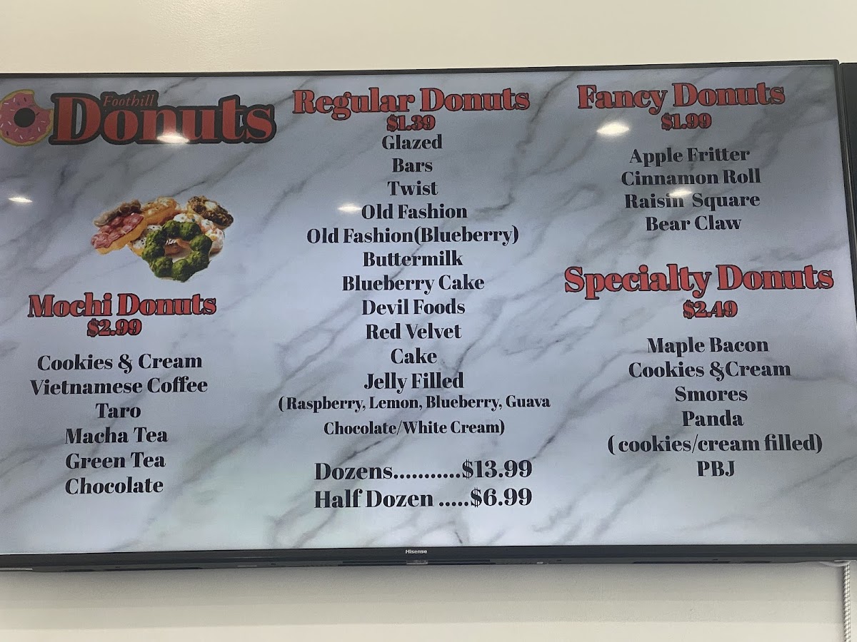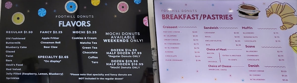 The menu at Foothill Donuts offers a straightforward and comforting selection perfect for any time you want a simple, satisfying treat or a casual bite. From classic donuts like glazed circles and Boston Cream to specialty options such as Maple Bacon and S’mores, there’s something to suit both traditional tastes and more adventurous cravings.